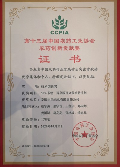 10月11日,第十三届中国农药工业协会农药创新贡献奖在上海揭晓,丰乐农化除草剂产品“丰乐封清”(55%苄嘧·丙草胺可分散油悬浮剂)荣获技术创新奖二等奖。此次是丰乐农化继杀菌剂“美金子”(31%福美双•丙环唑悬浮剂)、“精喹禾灵原药合成技术”、“半招净”(24%苯醚.咯.噻虫悬浮种衣剂)、除草剂“见封”获奖之后,第五次斩获该奖项。