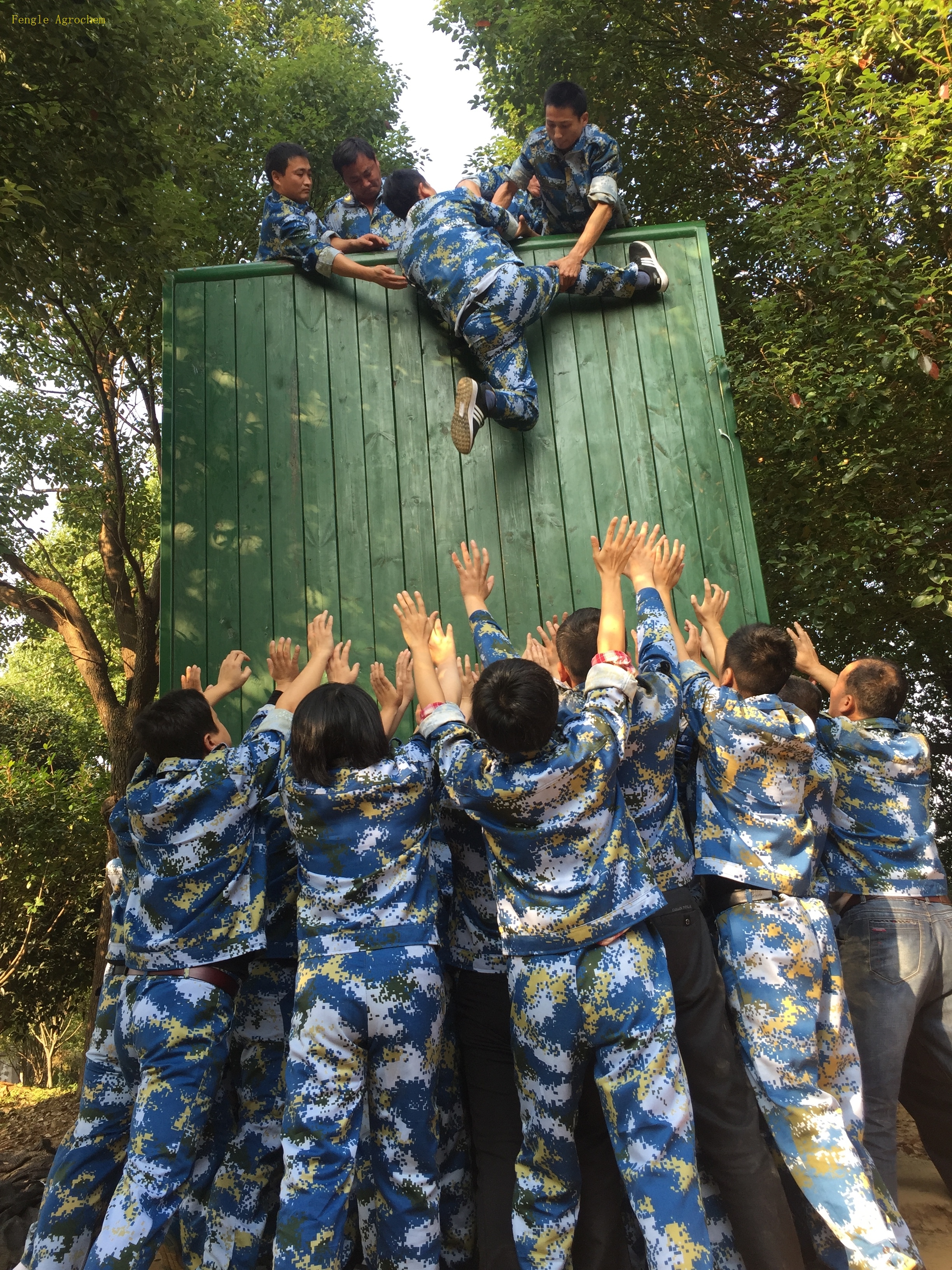 教练组制定了严格的培训纪律和丰富的培训项目,丰乐农化管理人员统一身着迷彩服,组建团队,选举队长、秘书、安保员、旗手,起队名、授队旗、画队标、定口号、定队歌……,标志着训练的正式开启。在接下来的项目活动中,“群龙取水”项目说明了一个人力量有限,借助于团队力量能把原本不可能的事情变成可能;“驿站传书”项目体现了一个团队需要有效的、高效的沟通;“急速60秒”项目说明了要整合资源的重要性,要善于和竞争对手合作,实现共赢;“挑战150”项目体现了团队成员之间要优势互补、分工明确、周密有序、忙而不乱才能达到整体有效协作完成任务;“沙场点兵”项目体现了领导层、指挥者、执行人之间要做到令行禁止,确保执行不走样;“雷阵”项目告诉我们要观察研究竞争对手,做到知己知彼;“高空抓杠”项目告诉我们管理人员要敢于担当、勇于挑战、超越自我;“翻越毕业墙”项目展现了团队的凝聚力和互相帮助的重要性,众志成城,只要有一个人没有翻越过去,就永不言弃。
