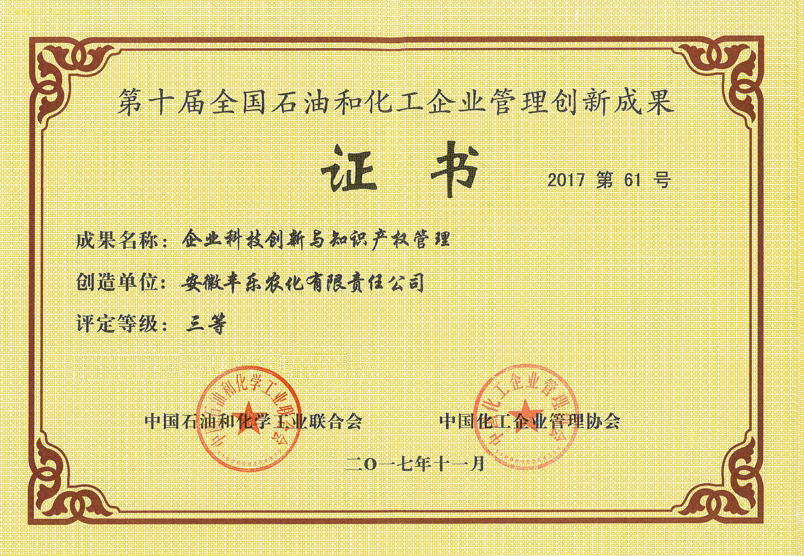 发掘企业管理创新经验,增强企业内生增长动力。11月1日,中国石油和化学工业联合会与中国化工企业管理协会共同发布了第十届全国石油和化工企业管理创新成果,丰乐农化报送的《企业科技创新与知识产权管理》获得三等奖,这是丰乐农化首次获得国家化工行业级的企业管理创新成果奖项。全国石油和化工企业管理创新成果发布至今已举办了10届,创新成果的实践与发布已经成为行业内最具有影响力的企业管理实践的交流和科研活动,在中国石油和化学工业企业管理现代化进程中发挥越来越大的作用。