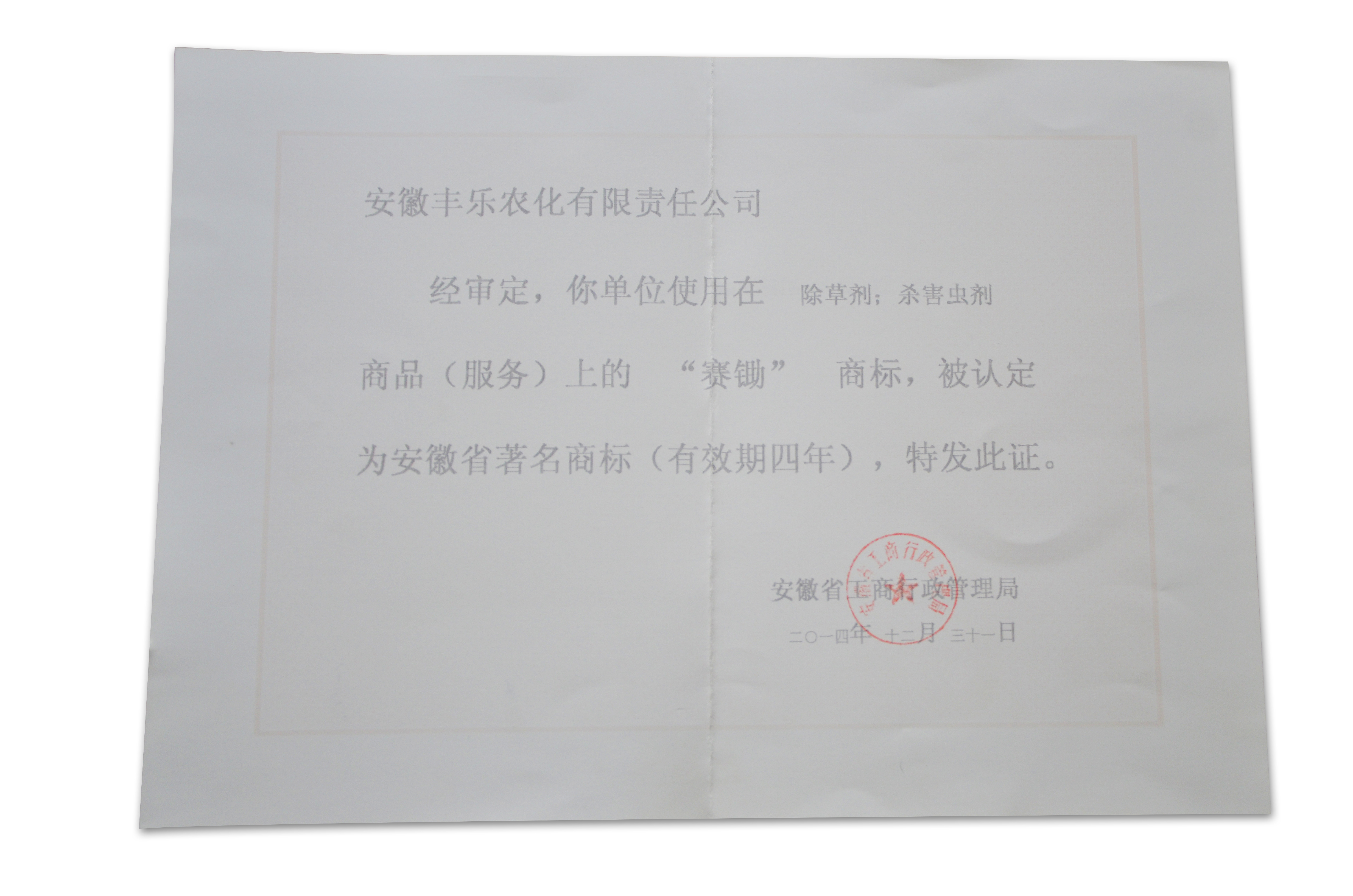 安徽省著名商标-赛锄(证书)