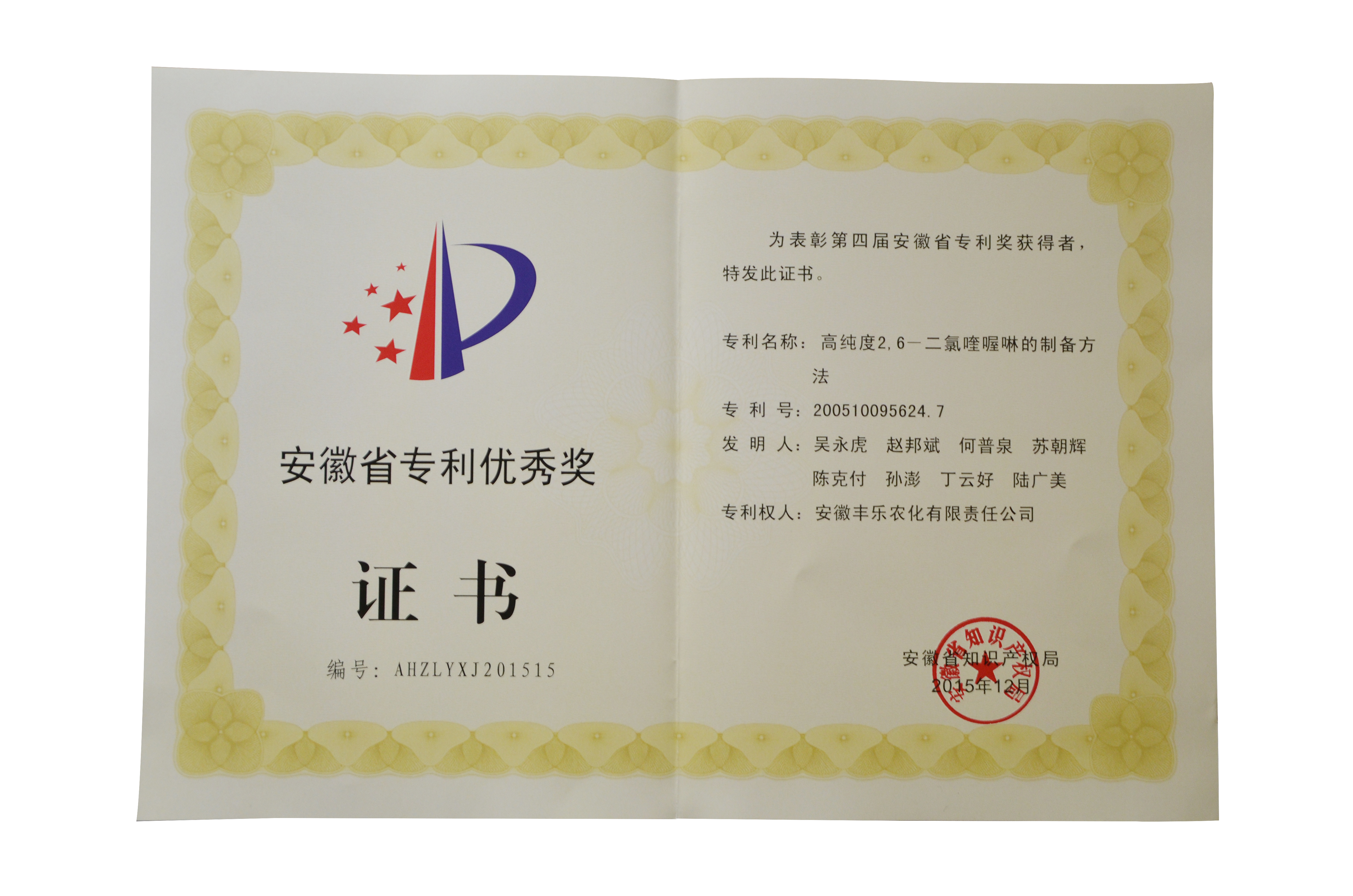安徽省专利优秀奖-高纯度2,6-二氯喹喔啉的制备方法(证书)